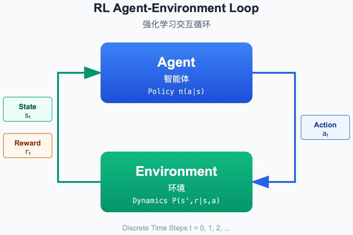 - Environment (世界) :接收动作,反馈新状态 S t + 1 S_{t+1} St+1 和奖励 R t + 1 R_{t+1} Rt+1。