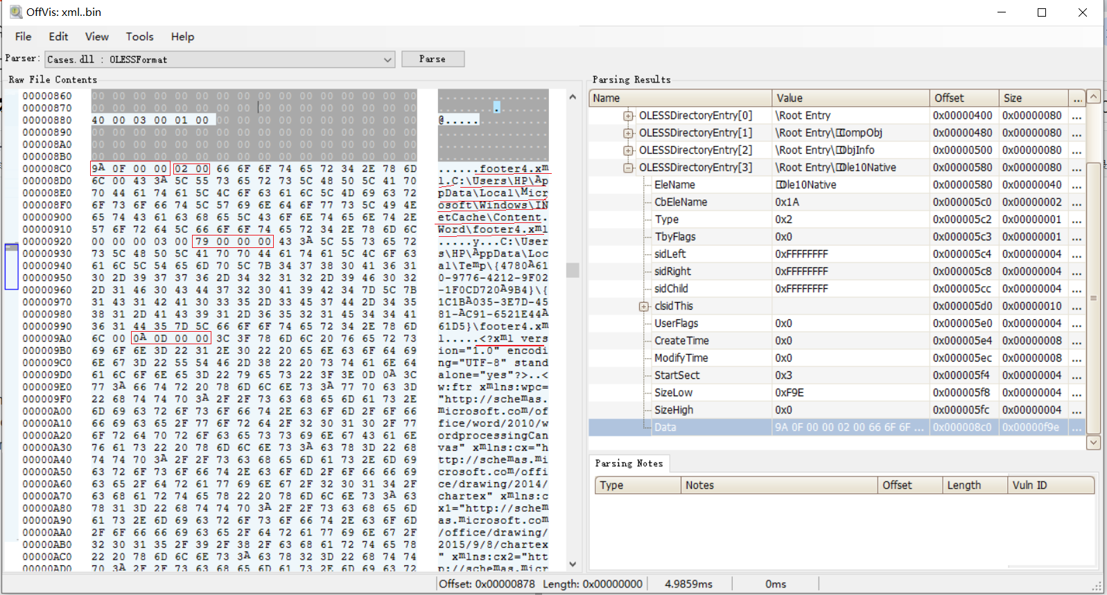 使用OffVis打开保存xml文件的OLE文件,双击\x01Ole10Native流所在条目的Data属性,如下图所示,窗口左侧显示OLE文件中Data属性保存的二进制数据,结合大模型给出的从\x01Ole10Native流提取原始数据的示例代码(代码有问题,没法直接运行),对数据流进行分析,开头4个字节应该为流数据大小,接着2个字节不清楚含义,然后就是原始文件名称及路径,这两个字符串都是以00结尾,然后4个字节不清楚含义,再紧跟4个字节,应该是指定后续字符串的字节数(看着也是原始文件临时路径),该字符串后面的4个字节应该是保存的原始文件的字节数,紧接着的就是原始文件的数据。