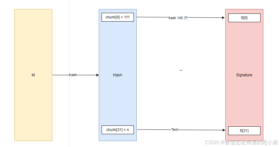 - 对chunk hash (256 - number) 次,得到的结果作为签名的一部分。例如:chunk0 是 0110_1111,则number 是十进制的111,所以我们对chunk0 hash 256 - 111 = 145 次