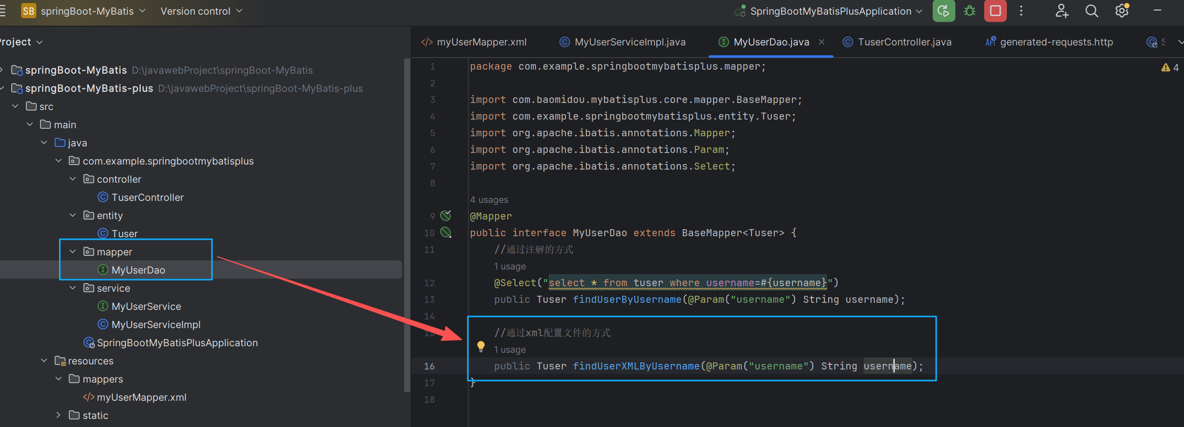 在mapper目录下创建一个MyUserDao接口,在此接口创建findUserXMLByUsername(String username)方法