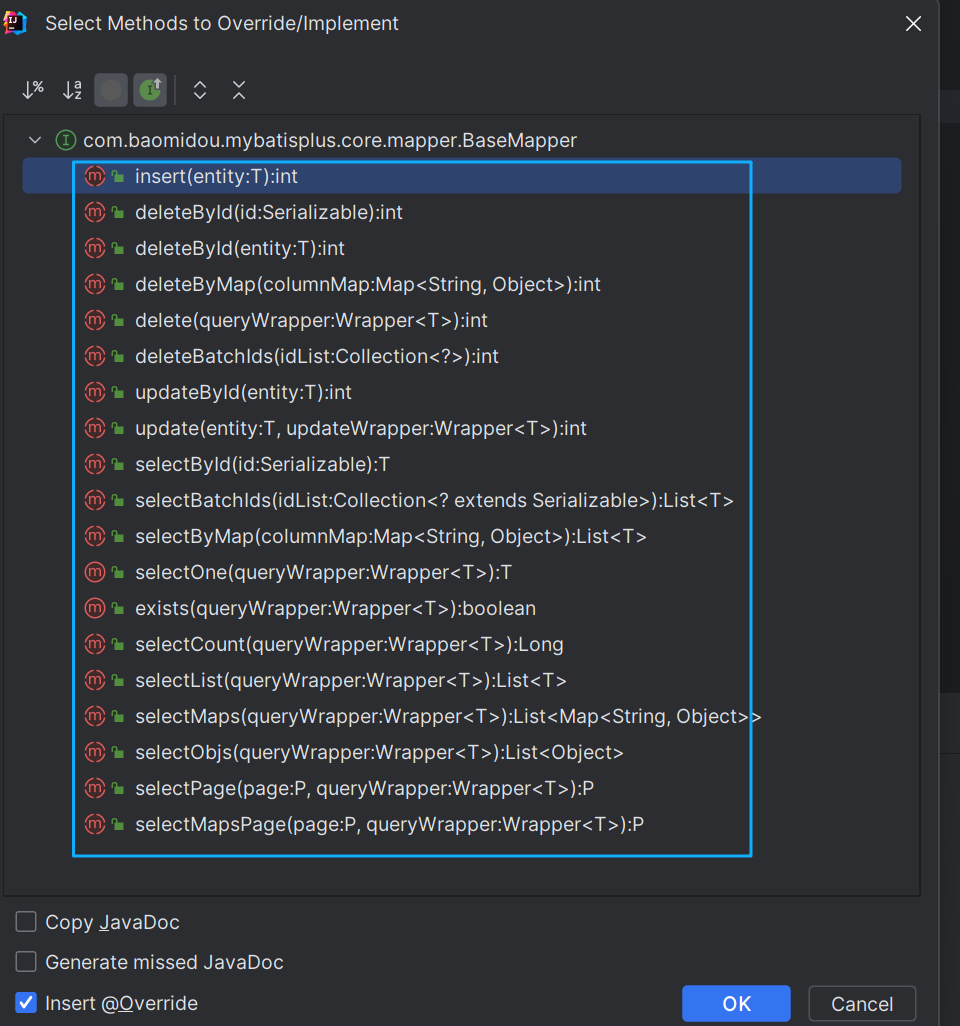由上图,MyUserDao接口里面暂时不用写通用的增删查改方法,MyUserDao接口继承了BaseMapper<Tuser>, BaseMapper<T >接口又是MyBatis-plus提供的基础Mapper接口,它继承了MyBatis的mapper接口,并增加了大量通用的CURD方法。
