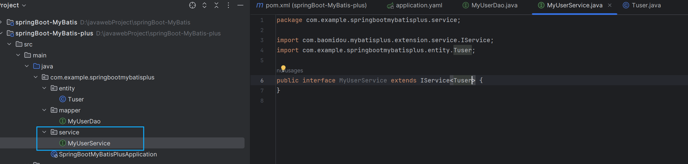 在service包下创建一个用于mapper接口文件的业务层操作接口MyUserService,代码如下: