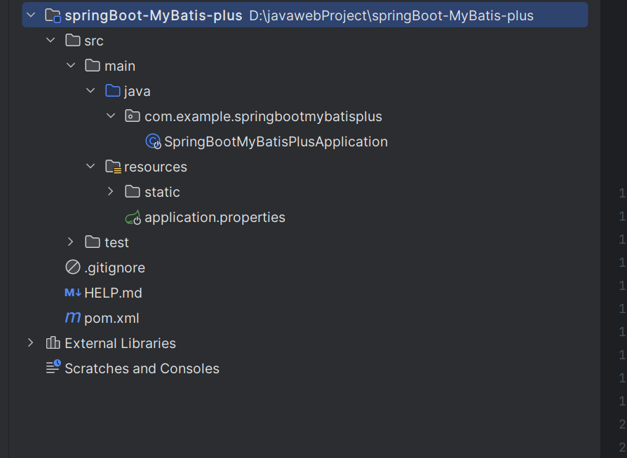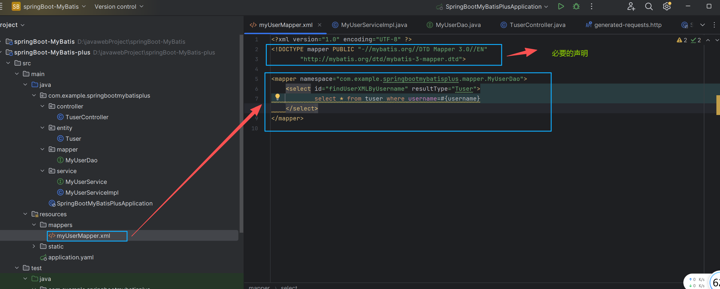 在 resources目录下创建mappers目录,并在mappers目录下创建一个名为 myUserMapper.xml的文件。这个文件与 com.example.springbootmybatisplus.mapper.MyUserDao接口绑定。