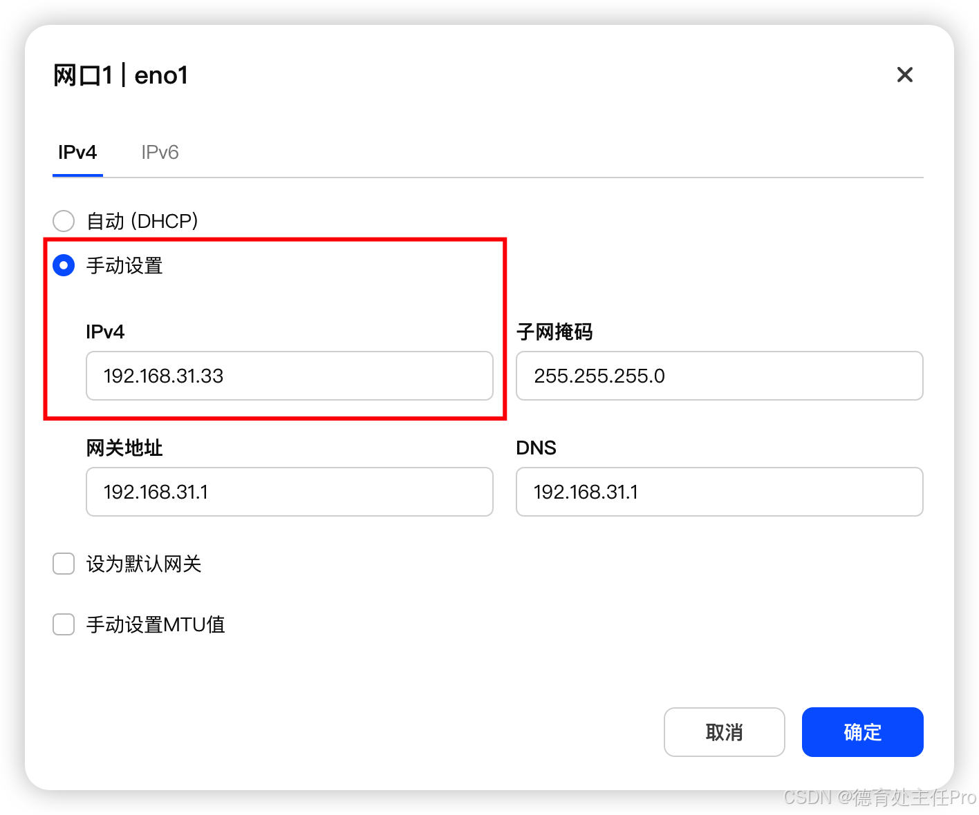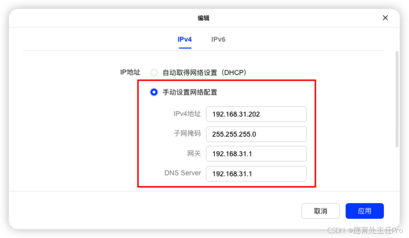 点击「编辑」按钮,将"IPv4"这项改为"手动设置网络配置",输入一个 IP 即可。