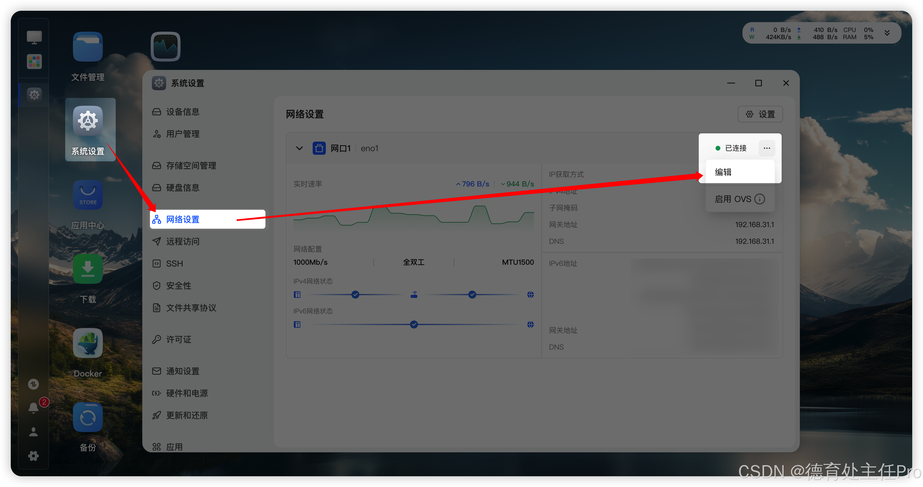打开「系统设置」,切换到「网络设置」面板,点击当前正在使用的「网口」的右侧的3个点,然后点击"编辑"。