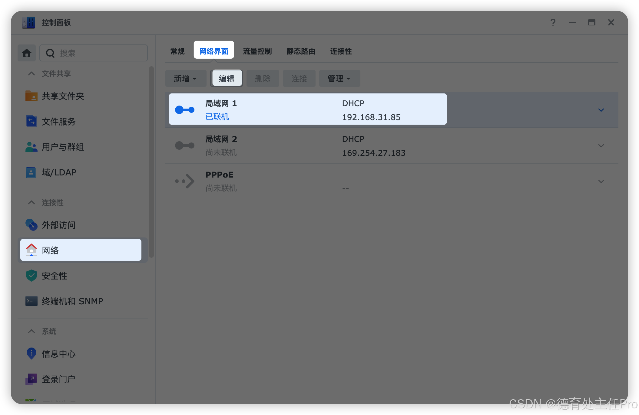 切换到「网络连接」面板,选择已连接的"LAN",点击编辑。