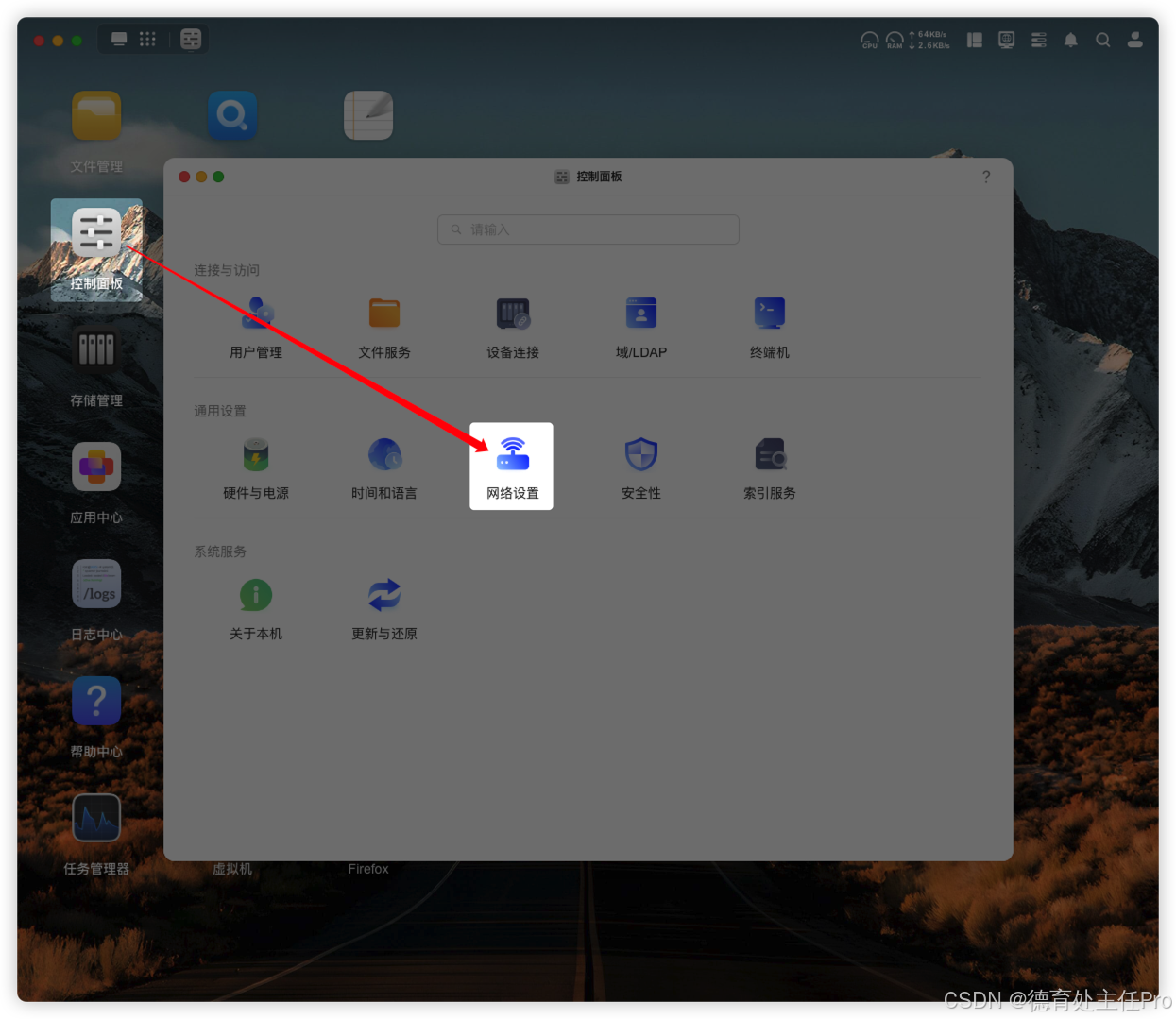 打开「控制面板」,选择「网络设置」。