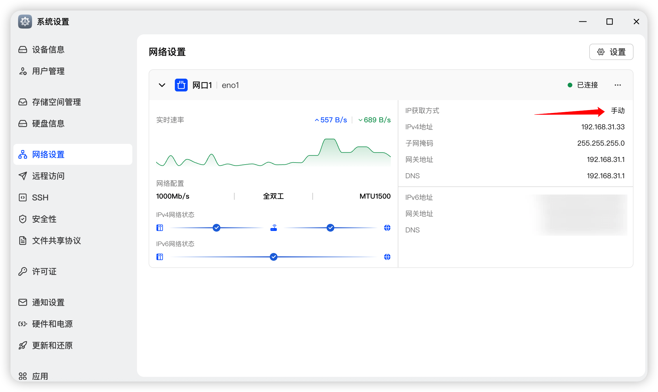 回到「网络设置」面板就能看到"IP 获取方式"这项从原本的"DHCP"变成"手动"了。