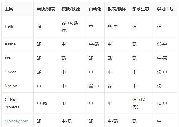下表给出小团队项目管理系统中常用工具对"最小可用流程能力"的定性对比,帮助做轻量决策: