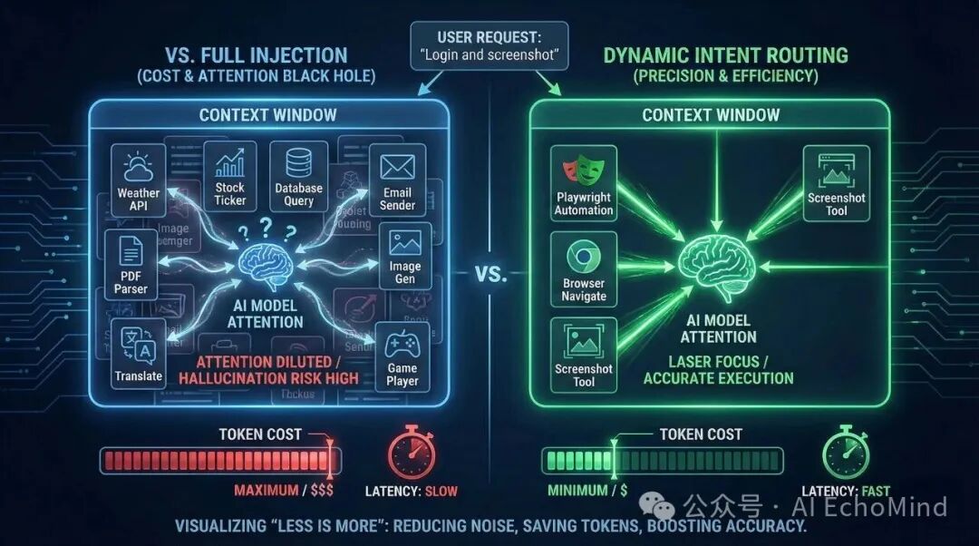 在 AI 开发圈,有个容易被忽视的"智商税":全量注入(Full Injection)。很多开发者习惯把所有 System Prompt 和工具定义一股脑塞给模型。结果就是:Token 飞涨、模型"幻觉"频发、响应慢得像上个世纪。用过"大龙虾"的小伙伴应该已经感受过了,原本速度很快的大模型,配置到"大龙虾"上面,就慢的跟蜗牛一样。其实,不是模型变慢了,超长的上下文,复杂的function call调用,让原本简单的任务变得十分的笨重。