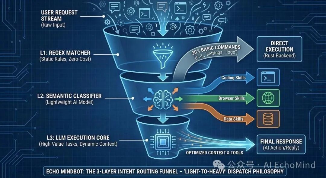 很多 Agent 看起来很聪明,其实是在用昂贵的 Token 堆砌假象。EchoMindBot的哲学是:用最轻量的逻辑,调动最强大的能力。