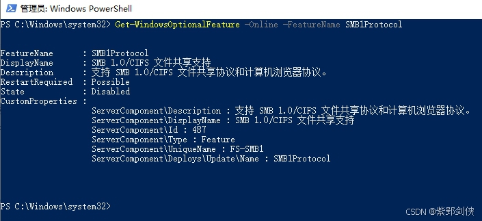 以管理员打开PowerShell,使用命令:Get-WindowsOptionalFeature -Online -FeatureName SMB1Protocol