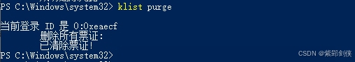 使用命令 klist purge,可以 清除 Kerberos 缓存,避免旧票据干扰。