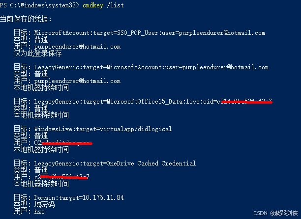 列出所有保存的凭据(找目标 IP/服务器): cmdkey /list
