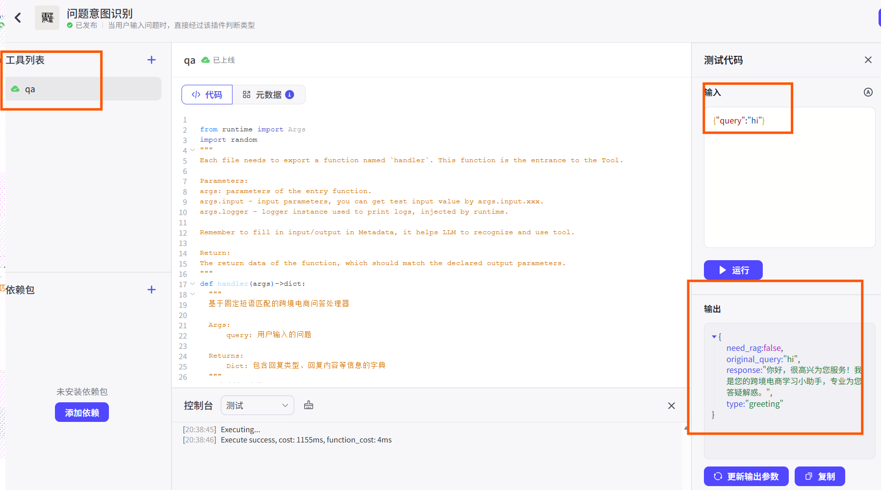 pythonfrom runtime import Args import random """ Each file needs to export a function named `handler`. This function is the entrance to the Tool. Parameters: args: parameters of the entry function. args.input - input parameters, you can get test input value by args.input.xxx. args.logger - logger instance used to print logs, injected by runtime. Remember to fill in input/output in Metadata, it helps LLM to recognize and use tool. Return: The return data of the function, which should match the declared output parameters. """ def handler(args)->dict: """ 基于固定短语匹配的跨境电商问答处理器 Args: query: 用户输入的问题 Returns: Dict: 包含回复类型、回复内容等信息的字典 """ # 去除首尾空格 query = args.input.query.strip() # 打招呼相关的固定短语 greeting_phrases = { # 基本问候 "你好", "您好", "hi", "hello", "嗨", "哈喽", "哈罗", "早上好", "下午好", "晚上好", "上午好", "中午好", "晚安", "早", "午安", "good morning", "good afternoon", "good evening", # 询问身份 "你是谁", "你是什么", "你叫什么", "你的名字", "介绍一下自己", "自我介绍", "你是什么东西", "你是哪个", "你是啥", # 询问状态 "你好吗", "怎么样", "还好吗", "你还好吗", "最近怎么样", "你在吗", "在不在", "还在吗", "在线吗", "你在线吗", # 询问能力 "你能干什么", "你会做什么", "你能做什么", "你的功能", "你有什么用", "你的作用", "你的职责", "你的用途", "你能帮我什么", "你可以做什么", "你会什么", "你懂什么", "能力介绍", "功能介绍", "你的能力", "你有什么功能", # 开始对话 "开始", "开始咨询", "开始对话", "开始聊天", "我想咨询", "我有问题", "我想问问题", "我想了解", "咨询一下", # 测试类 "测试", "试试", "试一试", "test", "testing", "试试看", "测试一下", "看看", "检查一下" } # 礼貌用语 thank_phrases = { "谢谢", "感谢", "多谢", "谢了", "thanks", "thank you", "thx", "3q", "3x", "谢谢你", "感谢你", "多谢了", "非常感谢", "十分感谢", "万分感谢", "太感谢了" } goodbye_phrases = { "再见", "拜拜", "bye","byebye","goodbye", "88", "走了", "告辞", "先走了", "下次见", "回头见", "有空再聊", "改天聊", "see you", "拜", "溜了", "闪了", "slip away" } # 人工服务相关短语 human_service_phrases = { # 直接要求人工服务 "人工服务", "人工客服", "人工坐席", "人工咨询", "人工帮助", "人工支持", "人工答疑", "人工解答", "人工回复", "人工对话", # 转接相关 "转人工", "找人工", "要人工", "转接人工", "转接客服", "切换人工", "接入人工", "联系人工","答疑入口", # 真人服务 "真人服务", "真人客服", "真人咨询", "真人对话", "真人帮助", "活人", "真人", "人类", "人工", "真的人", # 客服相关 "客服", "在线客服", "联系客服", "找客服", "客服电话", "客服微信", "客服qq", "官方客服", # 老师/导师 "联系老师", "找老师", "咨询老师", "请教老师", "老师帮忙", "专业老师", "课程老师", "指导老师", # 专业服务 "专人服务", "专人客服", "专业咨询", "专业服务", "专家咨询", "顾问咨询", "一对一服务", "专属服务", # 投诉和问题 "投诉", "举报", "反馈问题", "意见反馈", "服务投诉", "质量问题", "服务问题", "系统问题", # 售后相关 "退款", "退货", "售后", "售后服务", "退换货", "申请退款", "退费", "取消订单", "订单问题", # 不满意 "不满意", "有问题", "出问题", "不行", "太差了", "服务差", "回答不对", "答非所问", "听不懂", "不准确" } # 固定回复 greeting_response = "你好,很高兴为您服务!我是您的跨境电商学习小助手,专业为您答疑解惑。" polite_responses = { "thank": [ "不用客气,随时为您服务!", "很高兴能帮助到您!", "这是我应该做的,有问题随时找我哦!", "客气了,有什么问题尽管问!", "不客气,祝您跨境电商生意兴隆!" ], "goodbye": [ "再见!期待下次为您服务!", "祝您生活愉快,有问题随时来找我!", "再见!祝您跨境电商生意兴隆!", "拜拜!有问题随时回来咨询!", "再见!祝您学习愉快!" ] } human_service_response = "同学,点击 https://www.123.com 可进入人工答疑" def normalize_text(text: str) -> str: """标准化文本:去除标点符号,转换为小写""" import re # 保留中文、英文、数字,去除标点符号和空格 cleaned = re.sub(r'[^\w\u4e00-\u9fff]', '', text.lower().strip()) return cleaned def exact_match_check(query_text: str, phrase_set) -> bool: """精确匹配检查""" normalized_query = normalize_text(query_text) for phrase in phrase_set: normalized_phrase = normalize_text(phrase) if normalized_phrase == normalized_query: return True return False def contains_match_check(query_text: str, phrase_set) -> bool: """包含匹配检查(用于短查询中包含关键短语的情况)""" normalized_query = normalize_text(query_text) # 只有当查询很短时才使用包含匹配(避免误匹配) if len(normalized_query) <= 10: for phrase in phrase_set: normalized_phrase = normalize_text(phrase) if normalized_phrase in normalized_query or normalized_query in normalized_phrase: return True return False # 处理输入 query = query.strip() if not query: return { "type": "error", "response": "请输入您的问题。", "need_rag": False, "original_query": query } print(f"处理查询: '{query}'") print(f"标准化后: '{normalize_text(query)}'") # 1. 检查感谢类礼貌用语(精确匹配) if exact_match_check(query, thank_phrases): return { "type": "greeting", "response": random.choice(polite_responses["thank"]), "need_rag": False, "original_query": query } # 2. 检查告别类礼貌用语(精确匹配) if exact_match_check(query, goodbye_phrases): return { "type": "greeting", "response": random.choice(polite_respon