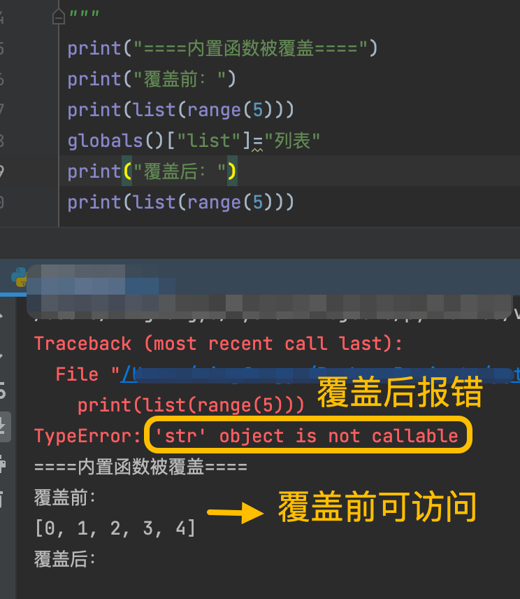 在程序中,如不小心覆盖内置函数,在访问中可能会遇到报错,如下所示
