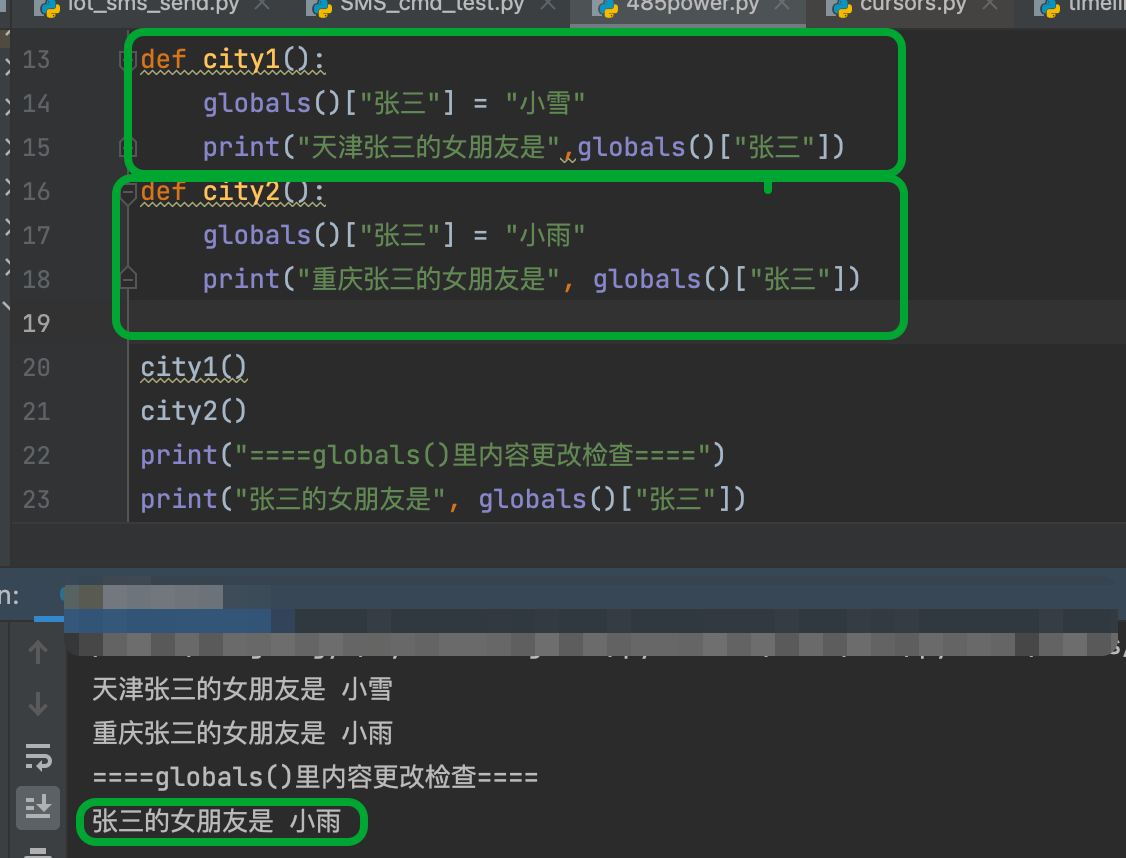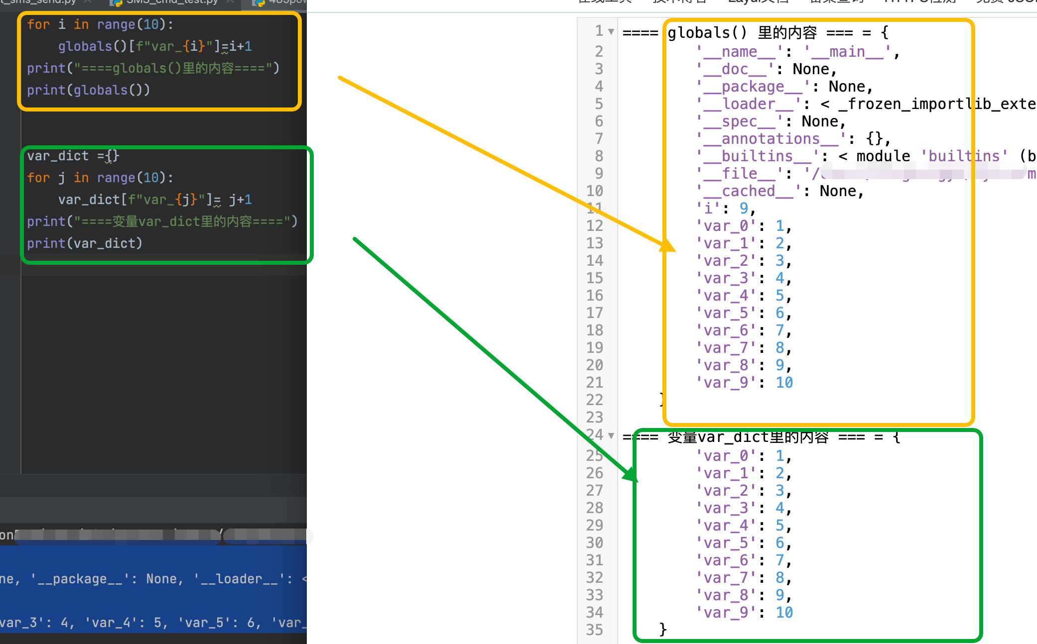 上方globals()里面变量/函数内容很多,某个变量随时可能被其他方法更改,当出现问题时,排查很困难。下方单独使用var_dict很清晰能知道变量是在哪里来的,在哪里修改的。