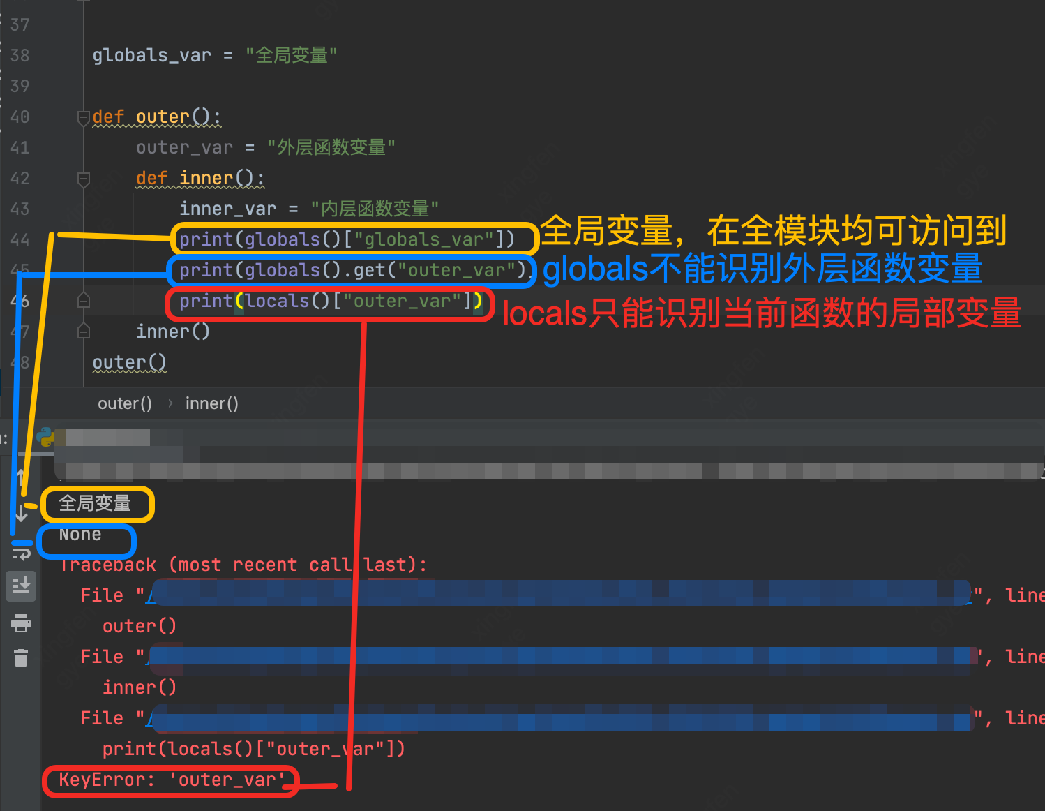 很多人会误以为globals()可以获取到外层函数作用域,实际是未搞清楚外层函数的变量的作用域为嵌套作用域,不会影响全局变量。嵌套函数想访问外层函数变量,需要使用nonlocal或local(),而非globals()