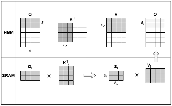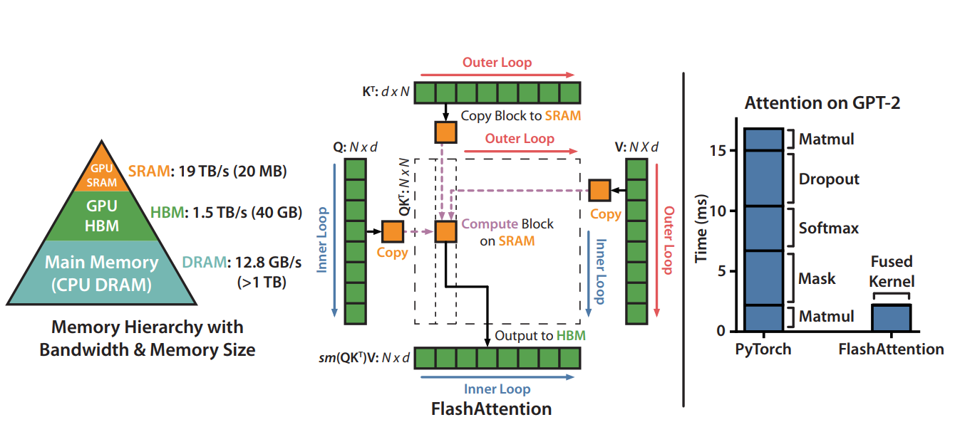 通过Tiling的方式减少SRAM和HBM之间的读写操作,从而提高Attention算子计算速度,并降低了中间激活值显存