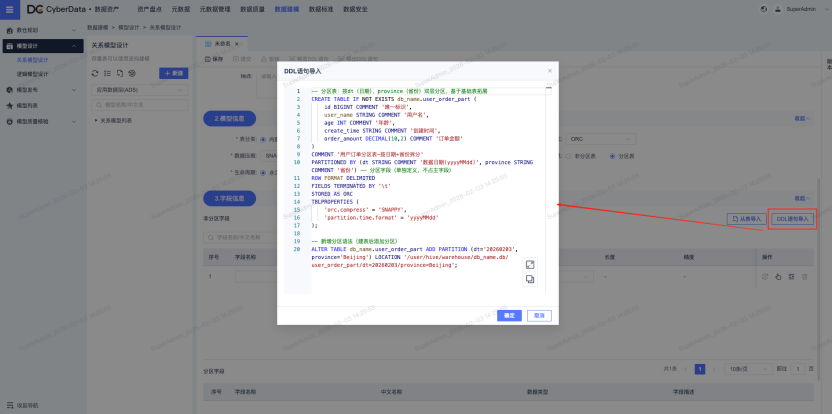 **· DDL 语句导入建模优化:**支持用户通过编写标准 DDL 语句一键导入数据表字段信息,自动识别字段名、数据类型、长度、精度等核心属性,无需手动逐一配置,大幅简化字段录入流程,适配技术人员操作习惯,助力模型快速构建与落地。