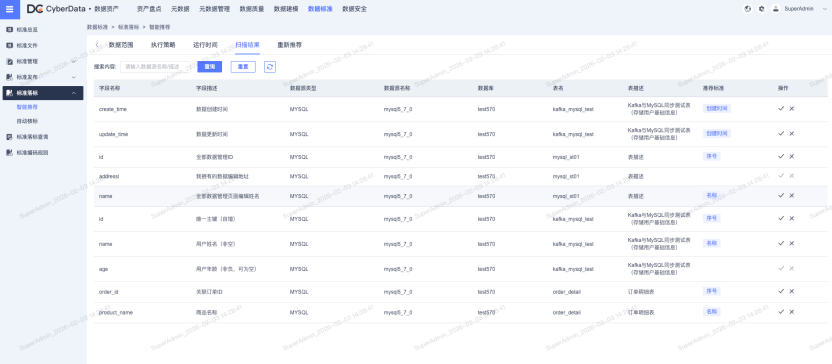 · **标准智能推荐:**基于已配置的标准策略,自动扫描数据源字段,智能推荐匹配的字段标准与数据元;支持自定义扫描范围与执行频率(定时/手动触发),提供完整的扫描日志与结果确认功能,大幅降低人工匹配成本。