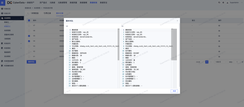 **· 精细化版本与批量管理:**新增字段标准版本对比功能,直观呈现不同版本的标准差异,便于追溯变更轨迹;支持数据元批量导入并自动反解析格式,显著提升标准配置效率。