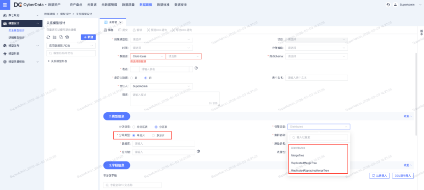 **· Clickhouse 数据源深度适配:**支持 Clickhouse 类型数据源的表/视图建模,引擎类型覆盖 Distributed、MergeTree、ReplicatedMergeTree、ReplicatedReplacingMergeTree,可根据业务需求配置分区表或非分区表;当引擎类型为 Distributed 时,支持单分片与多分片部署模式,适配大规模数据存储场景。