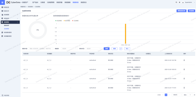 **· 标准自动核标:**支持配置核标任务(定时/手动执行),对已落地标准的字段进行自动校验,实时反馈标准符合性结果,辅助技术人员快速定位非标数据,提升数据质量。