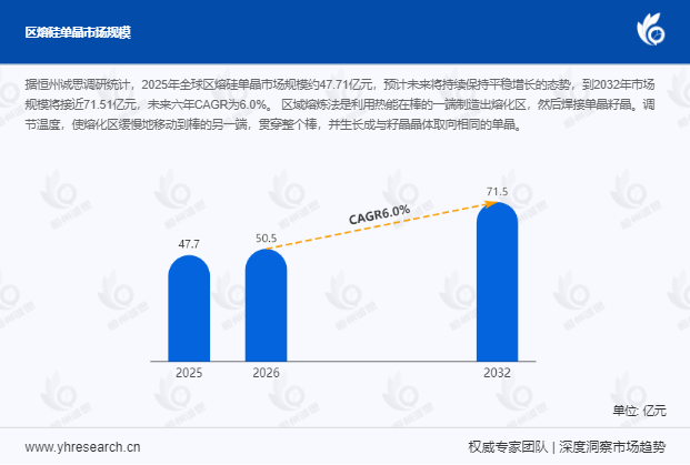 据恒州诚思最新调研数据显示,2025年全球区熔硅单晶市场规模预计达47.71亿元,基于当前行业发展趋势,预计未来六年将以6.0%的复合年均增长率(CAGR)稳步扩张,至2032年市场规模将接近71.51亿元。这一增长态势受多重因素驱动,其中可再生能源转型与半导体行业扩张构成核心动力,而供应链中断风险则成为制约行业发展的关键变量。