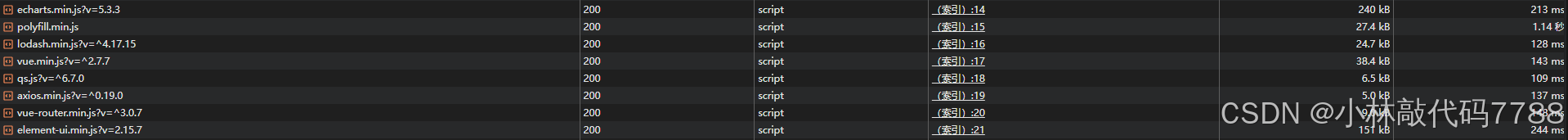 除了 Gzip,我还对代码进行了分包处理。在 vite.config.ts 中,通过 VitePluginHtml 和 external 配置,将 ECharts、Vue、Element-UI 等抽离出去,由外部 CDN 加载。