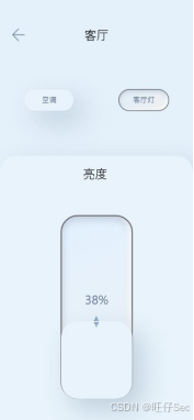 1.客厅控制页面顶部显示【返回】按钮图标和【客厅】文本,点击【返回】按钮,返回到控制列表页面;中部显示【空调】、【客厅灯】按钮,默认选中【客厅灯】按钮,弹出灯光亮度调节弹窗。