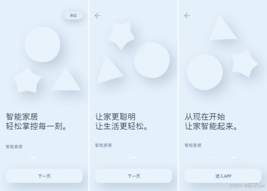 2.第一个引导页面,顶部右上角显示【跳过】按钮,【跳过】按钮为圆角边框样式;点击【跳过】按钮,跳转至登录页;显示背景图片,背景图片上部由圆形、三角形、星形共同组成;页面显示标题【智能家居轻松掌握每一刻。】和副标题【智能家居】;底部显示【下一页】按钮,点击后可跳转至下一张引导页面。