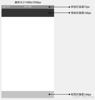 3.画板尺寸为 1080×1920,状态栏高度 72px,标题栏(导航栏)高度为 168px,标签栏高度为 144px。