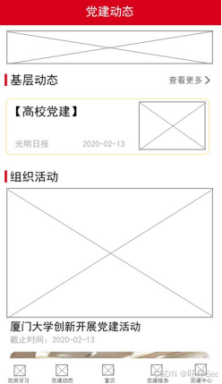 2.页面分为三个部分,显示党建动态轮播图,中间部分显示基层动态新闻信息,下半部分显示组织活动信息。