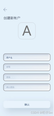 2.创建新账户页面,顶部左上角显示【返回】按钮,点击【返回】按钮可返回至注册登录选择页面;【返回】按钮下方显示【创建新账户】标题;【创建新账户】标题下方显示用户头像,用户头像水平居中,边框为圆角矩形,头像中的字符为用户名输入框中第一个字符的大写;下方显示输入表单,包括:【用户名】输入框、【邮箱】输入框、【密码】输入框、【确认密码】输入框以及【确认】按钮;【用户名】输入框必须由数字和字母的组,不能少于 6 位;首个字符须为英文字母;【密码】输入框只能输入数字、字母和@符号,长度为 6-12 位字符;【邮箱】输入框须符邮箱验证格式 XXX@XXX.XXX(X的位数不限)。