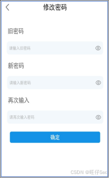 7.修改密码页面,显示旧密码输入框、新密码输入框、再次输入密码输入框和"确定"按钮,输入框内显示对应提示语,点击每个输入框,可以显示输入的示例信息;点击"确定"按钮,弹出修改成功提示框,三秒后自动跳转到设置界面。