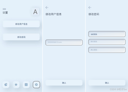 7.修改用户信息页面顶部显示【返回】按钮图标和【修改用户信息】文本,点击【返回】按钮,返回到设置页面;中部显示【邮箱】输入框和【确认】按钮,【邮箱】输入框默认显示当前用户注册的邮箱;点击【确认】按钮,判断邮箱格式是否正确(格式:XXX@XXX.XXX
