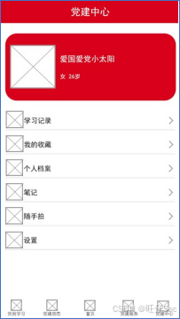 1.党建中心界面显示【党建中心】标题,界面上半部分显示用户头像、个人名称、性别、年龄;