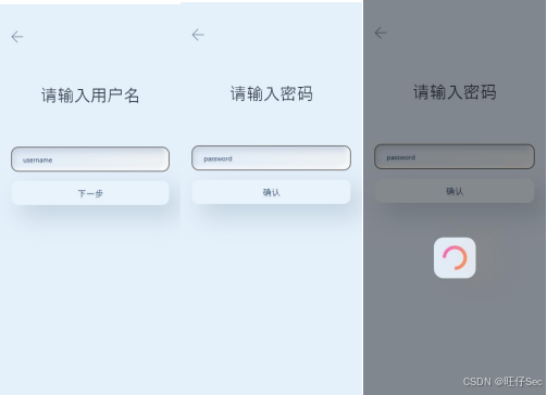 2.密码输入页面顶部左上角显示【返回】按钮,点击【返回】按钮可返回至用户名输入页面;居中显示【请输入密码】标题、【密码】输入框、【确认】按钮;在【密码】输入框输入密码后,点击【确认】按钮弹出等待对话框,如果用户名和密码与本地存储的一致,则跳转至首页页面,如果用户名或密码错误,则做出友好提示。