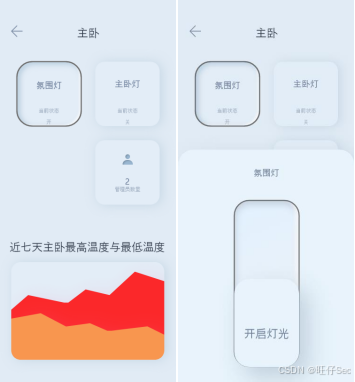 4.底部显示【近七天主卧最高温度与最低温度】文本和堆叠面积图。最高温度面积图背景为红色,最低温度面积图背景为橙色;每次进入主卧控制页面,堆叠面积图自动刷新,同一天最低温度不可超过最高温度。