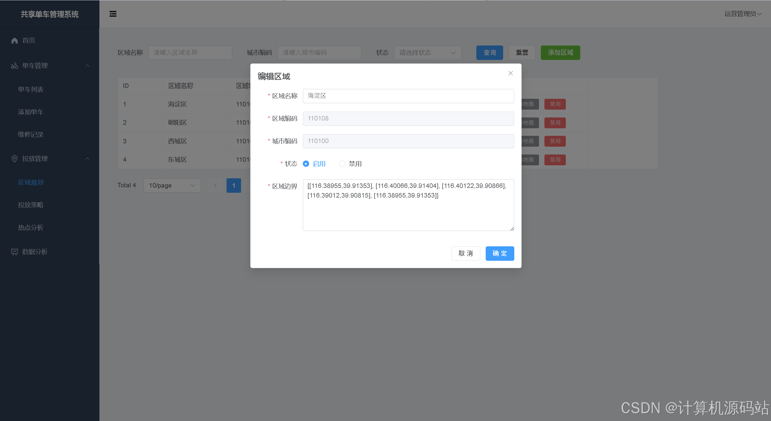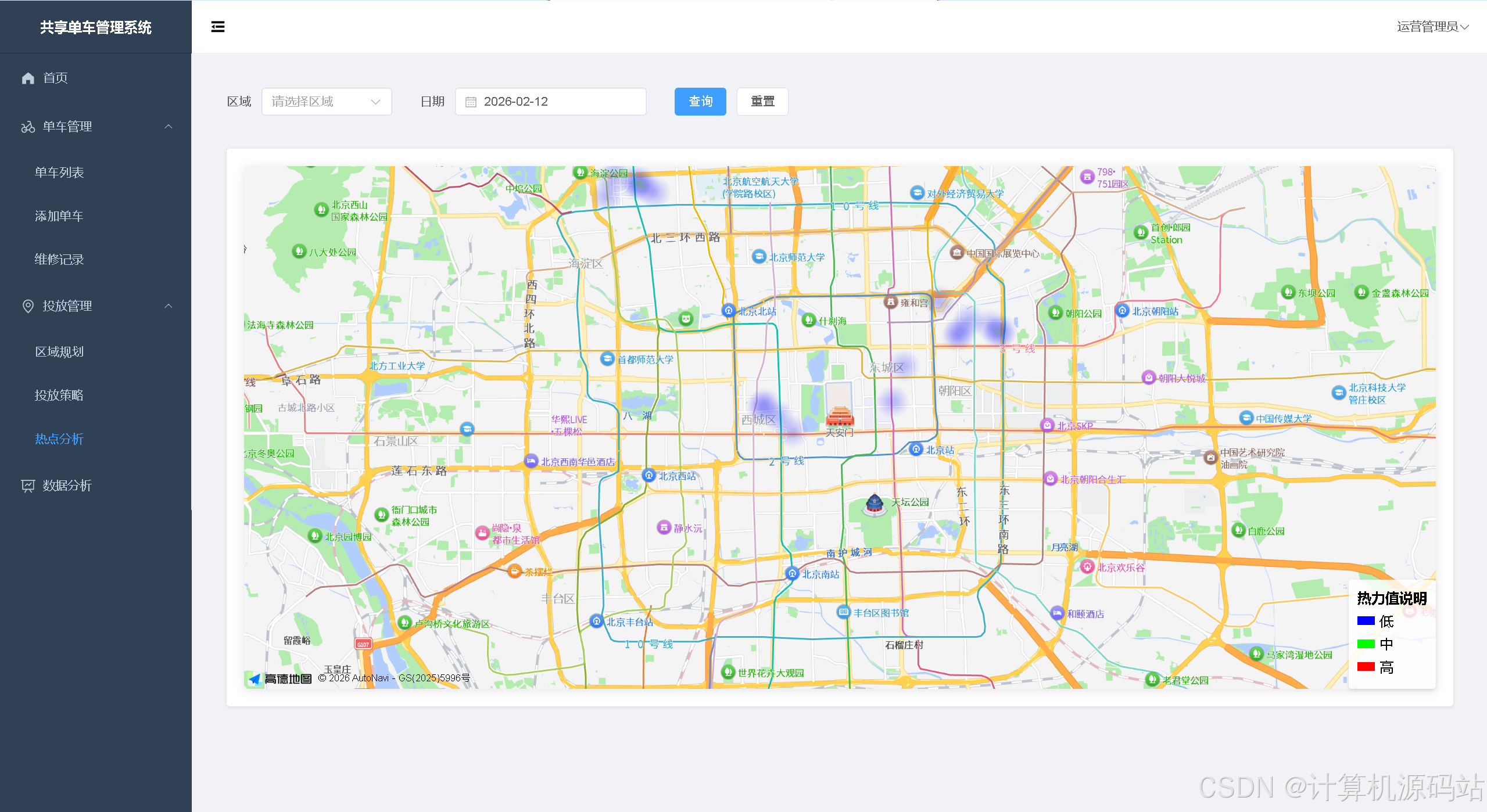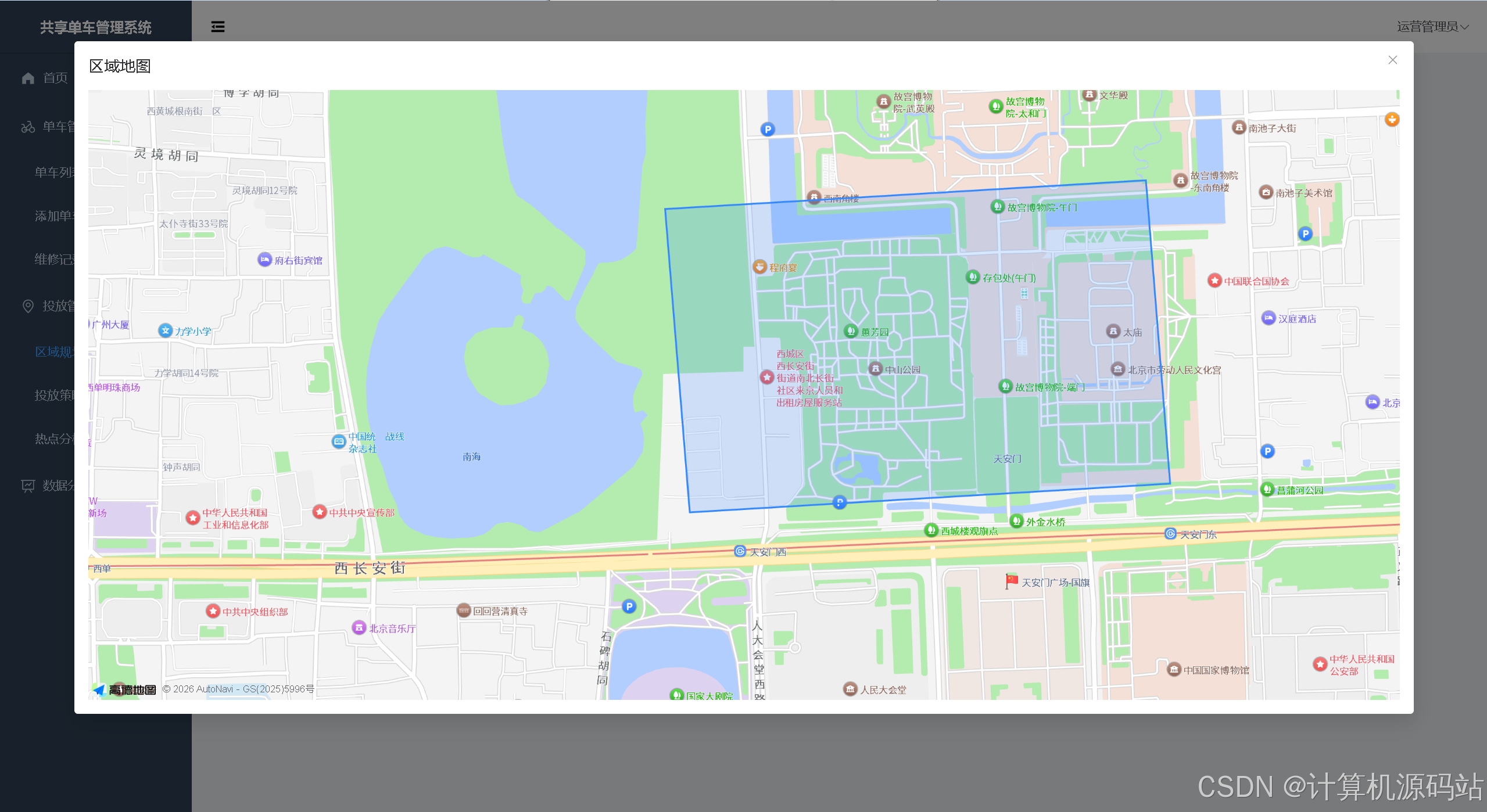 - 报修、维修管理、区域规划管理(电子围栏)、投放策略、热点分析、订单列表、异常列表、用户管理、用户反馈