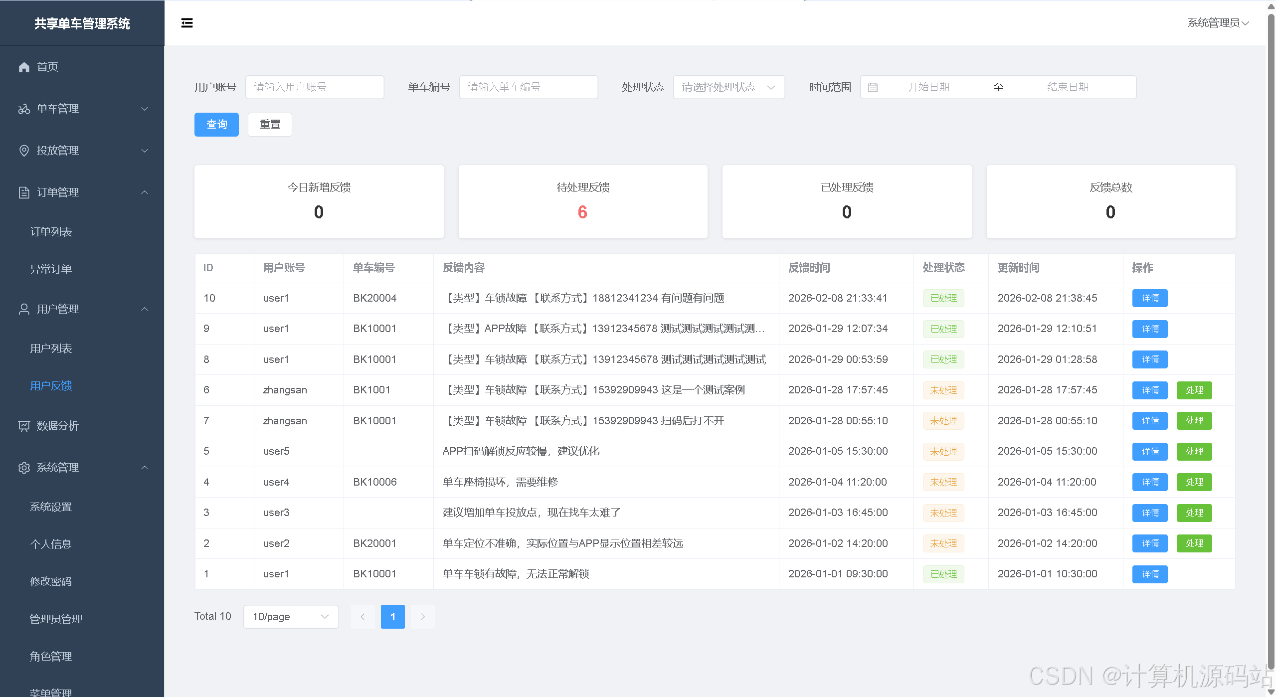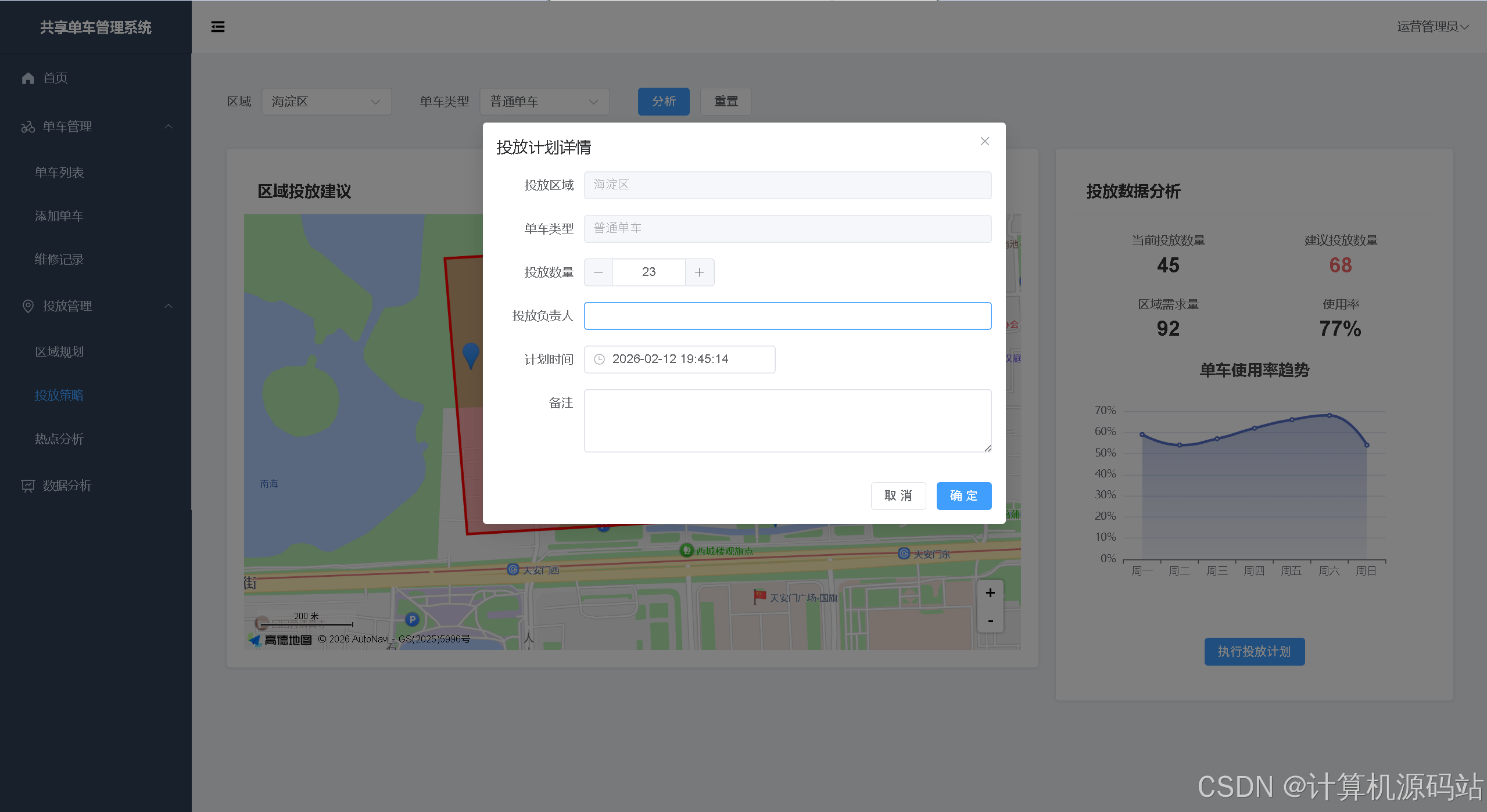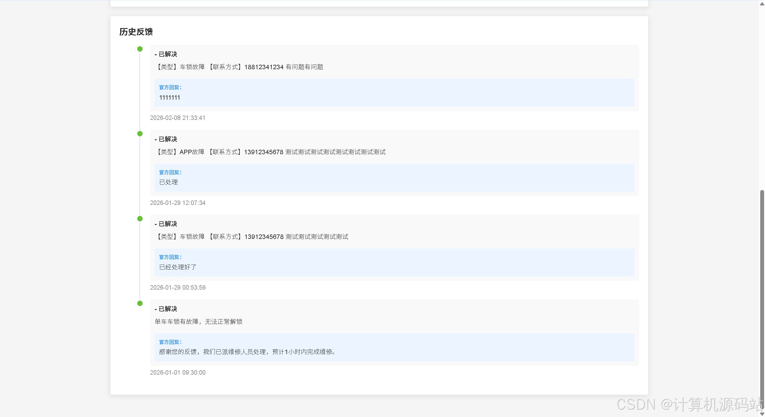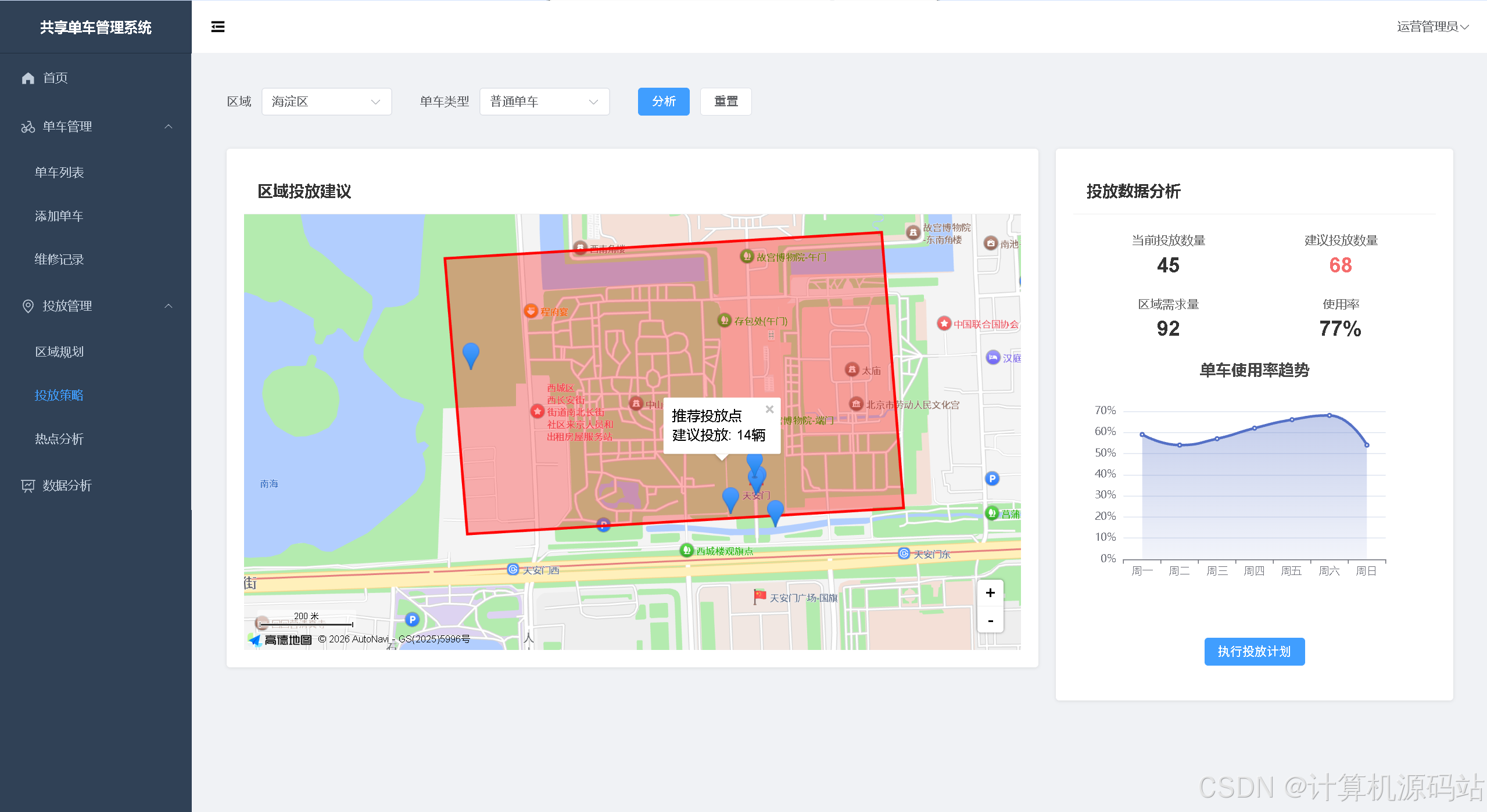 - 报修、维修管理、区域规划管理(电子围栏)、投放策略、热点分析、订单列表、异常列表、用户管理、用户反馈