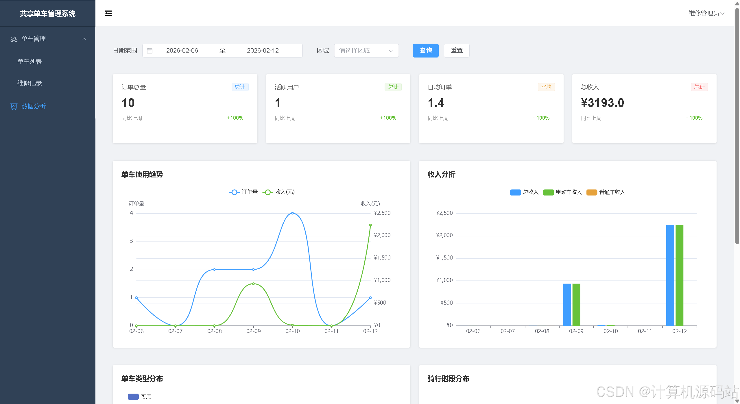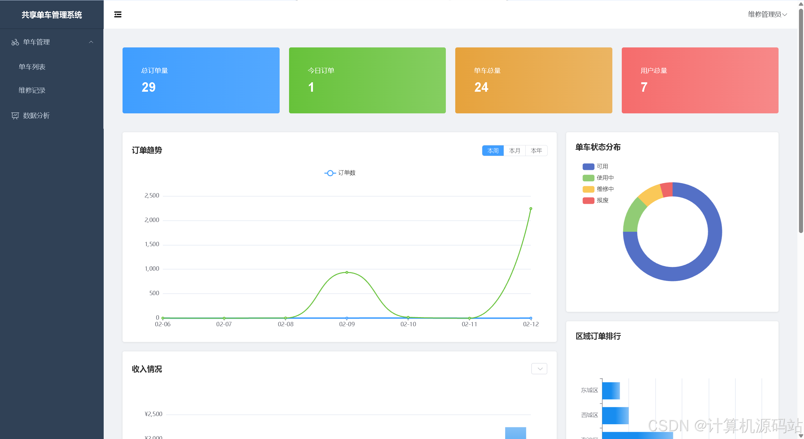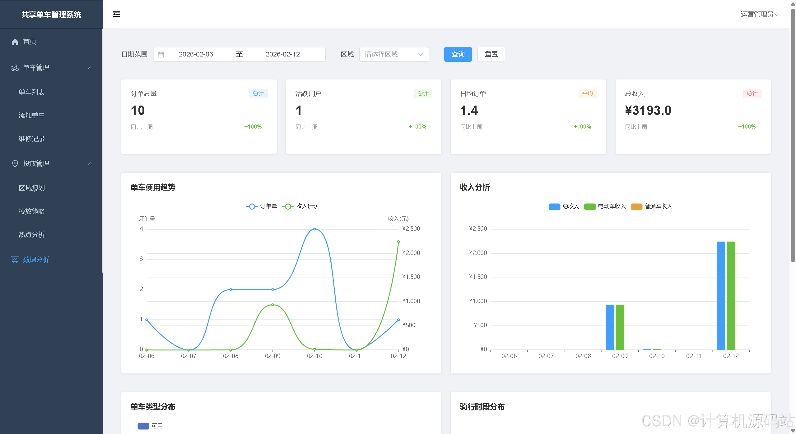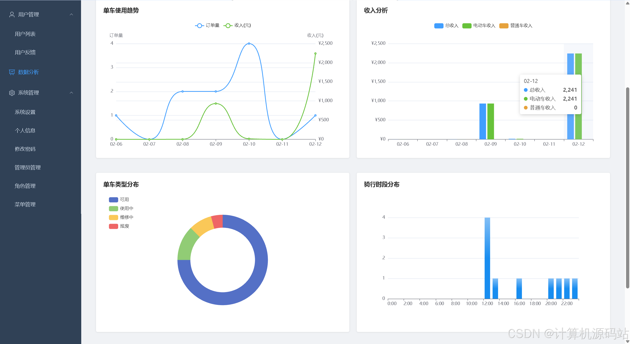 - 数据分析:订单总量、活跃用户、日均订单、总订单、单车使用趋势、收入分析、骑行时段分布