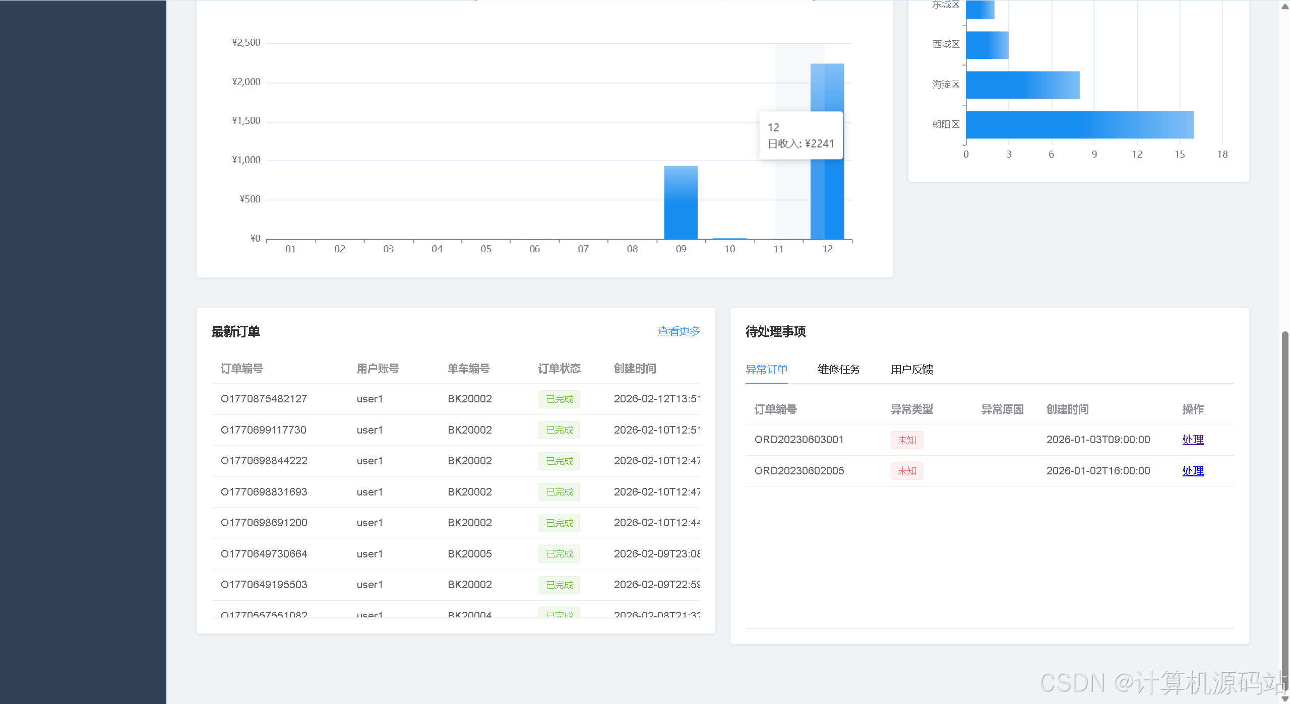 - 首页大屏数据图表统计:用户数、订单数、今日订单数、单车总量、订单趋势曲线图、收入柱状图、区域订单排行柱状图、订单状态分布环状图