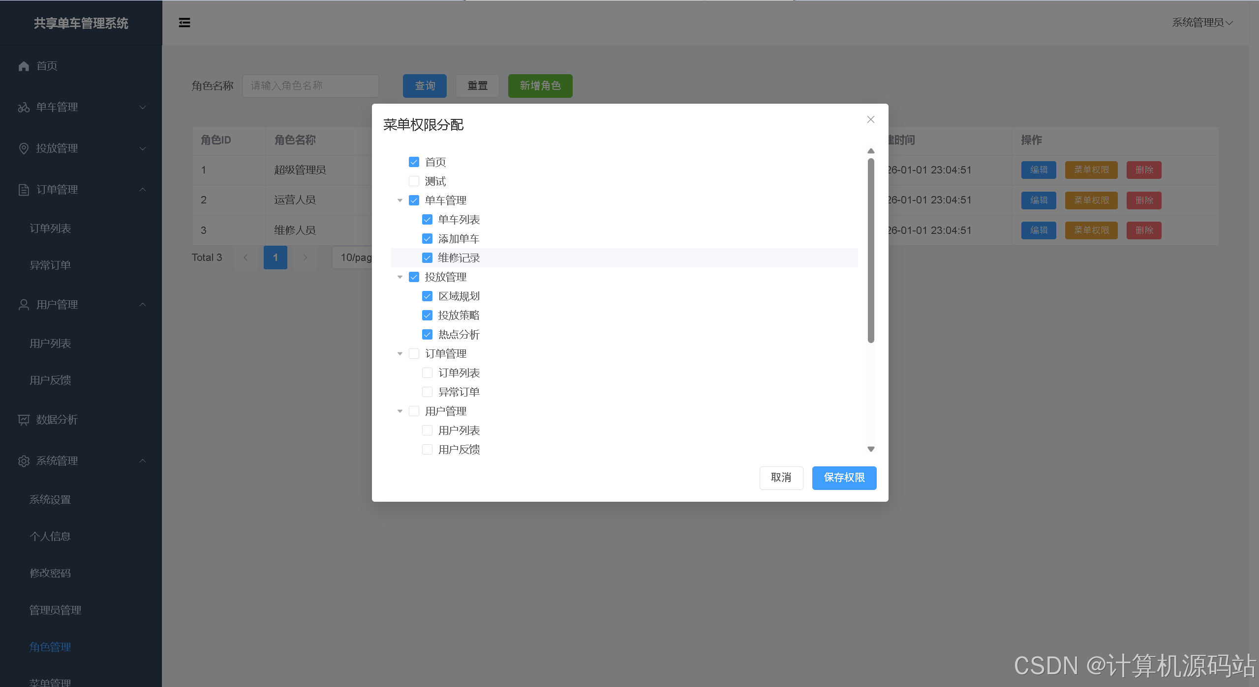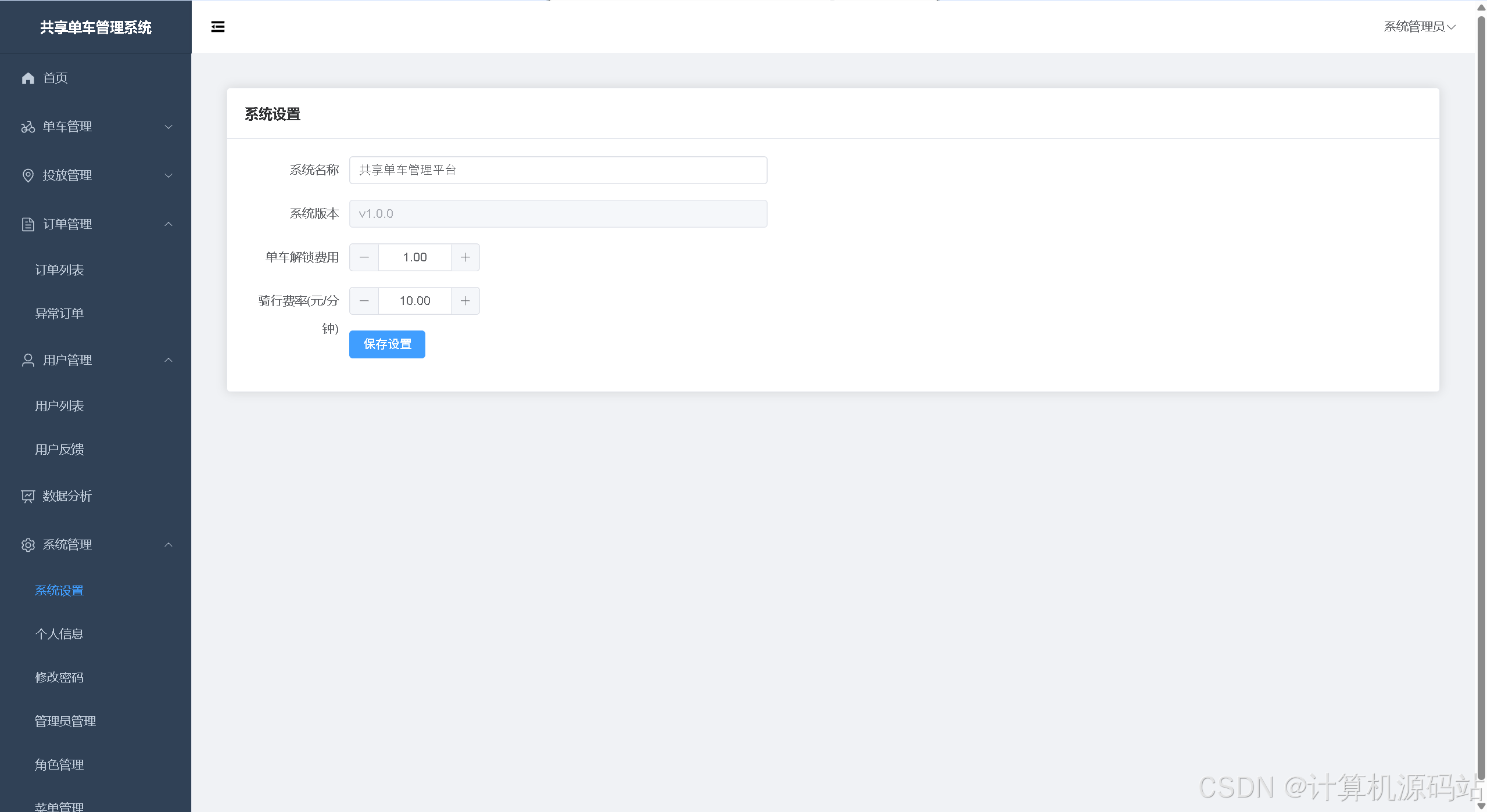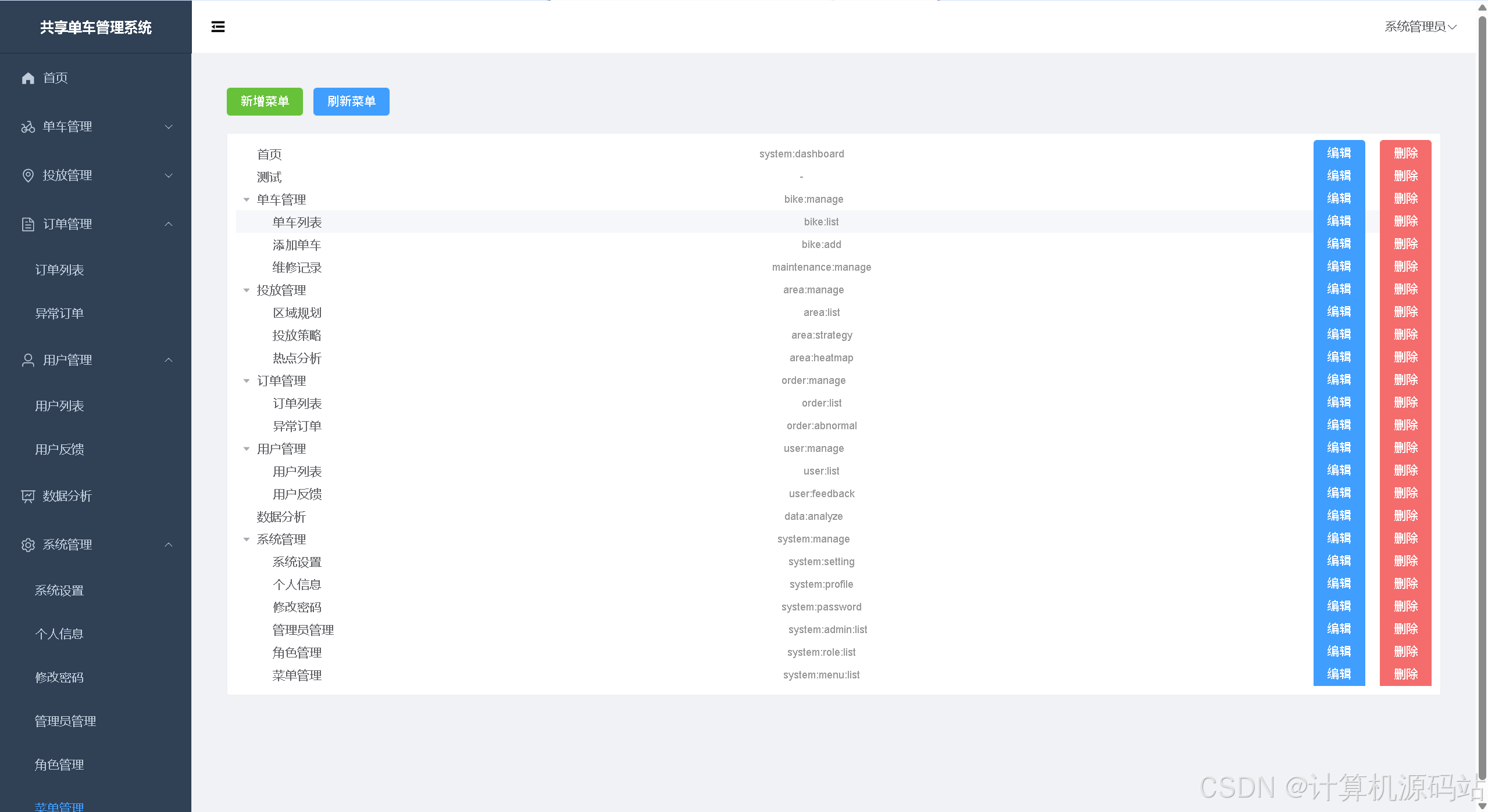 - 单车费用设置、个人信息、管理员管理、角色管理、菜单管理