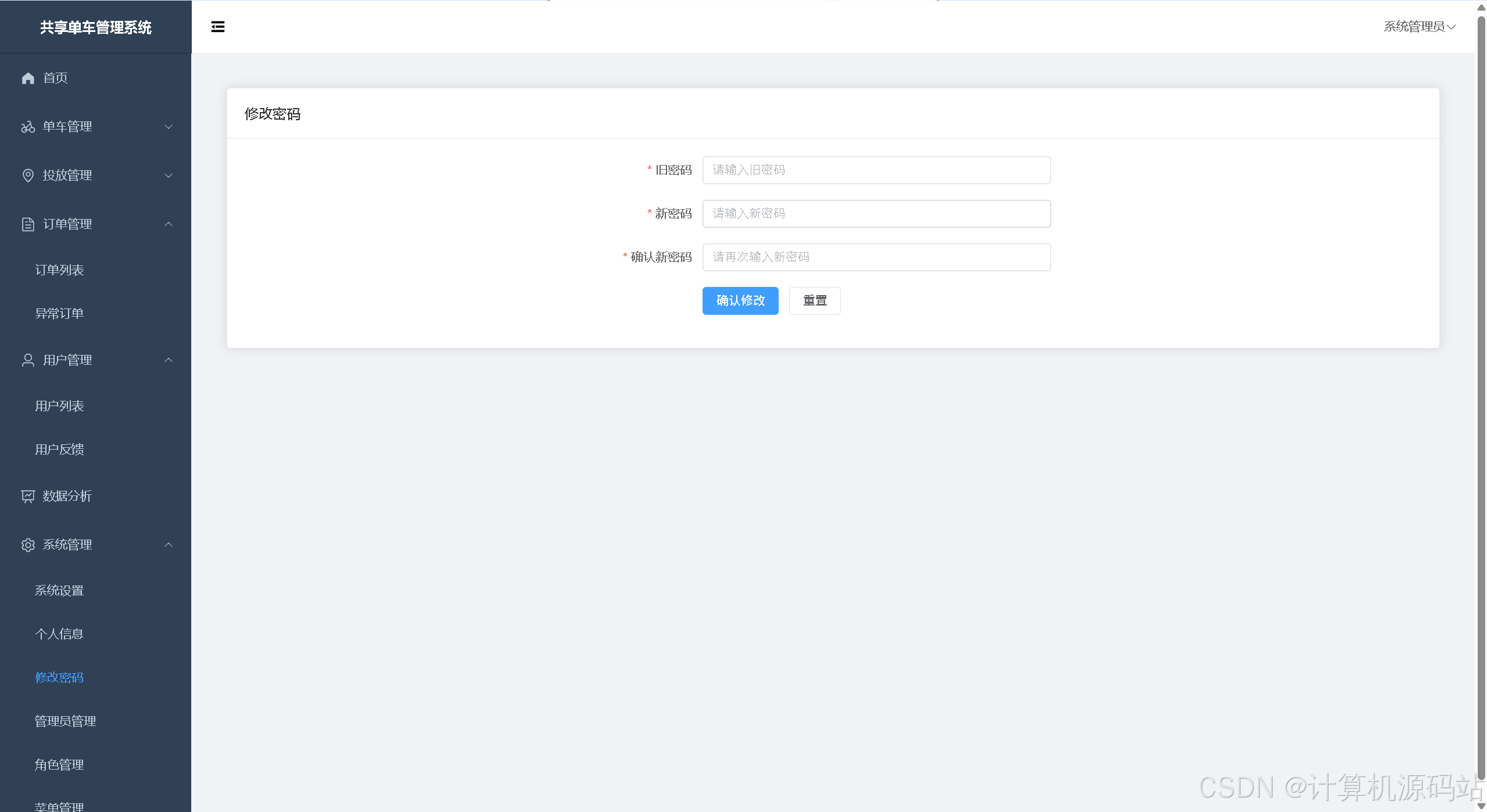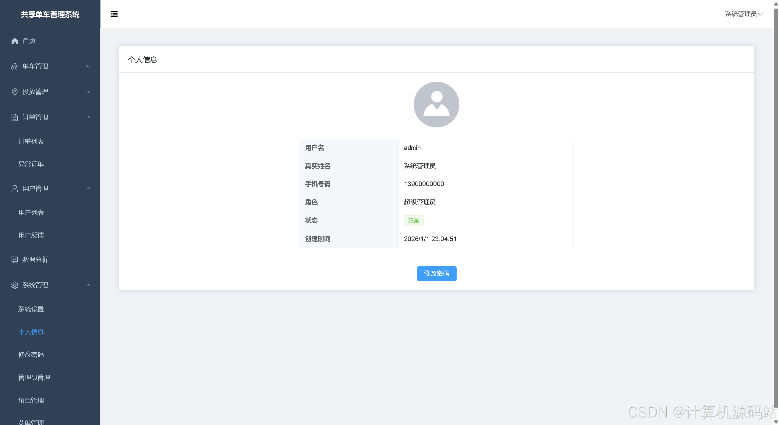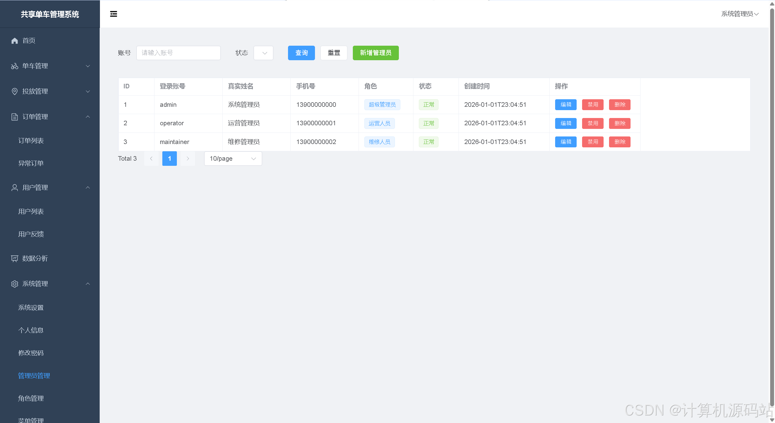 - 单车费用设置、个人信息、管理员管理、角色管理、菜单管理