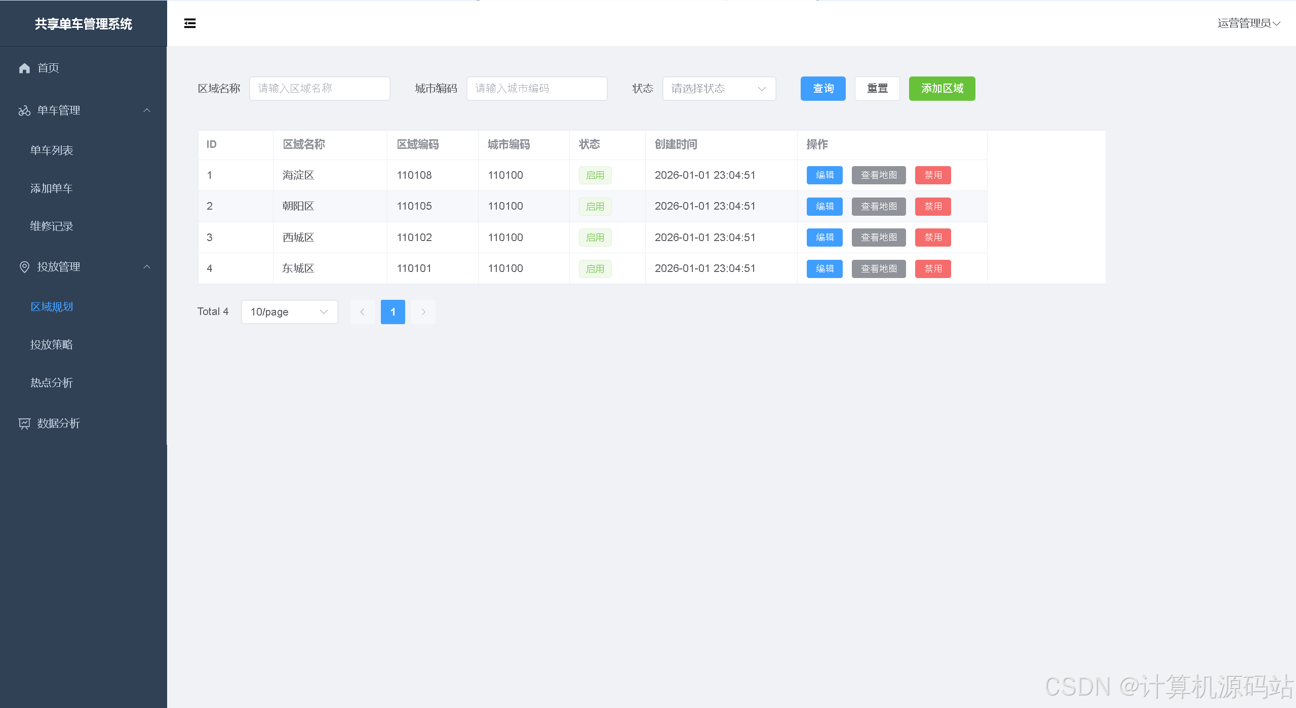 - 单车管理:报修、维修管理、区域规划管理(电子围栏)、投放策略、热点分析、订单列表、异常列表、用户管理、用户反馈