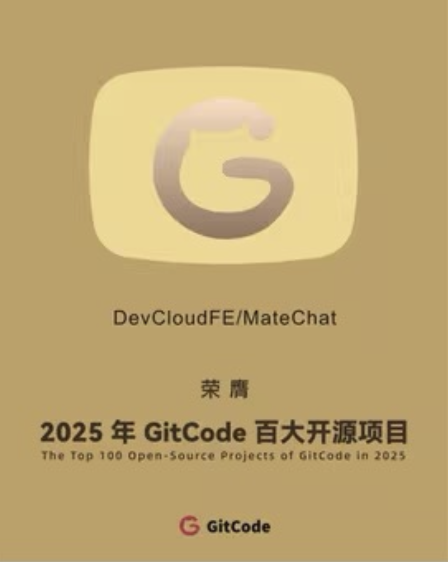 行业认可度提升: 获评 AtomGit 2025 年度 G-Star 开源组织 ,核心项目 MateChat 入选GitCode 百大开源项目,成为前端智能化开源领域的标杆力量。