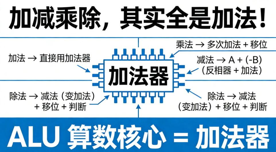 电脑不会直接算减法、乘法、除法,比如算 5-3,其实是算 5+(-3);算 3×2,其实是 3+3,所以所有算数运算的本质都是加法,全靠前面说的 "加法器" 这个零件完成,这是 ALU 的核心功能。