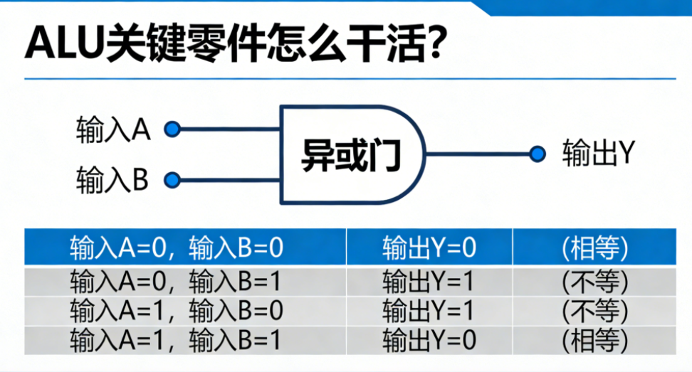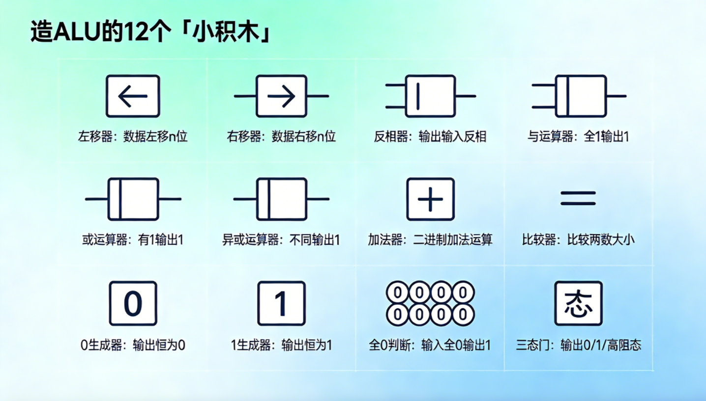 简单说,ALU 就是 CPU 的 "计算器 + 裁判",电脑里所有的算数计算(比如 1+1)、逻辑判断(比如判断两个数是否相等、谁大谁小)都是它干的,课文就是教我们 "徒手造一个简易 ALU",先拆出造 ALU 需要的 12 个小零件,再教你把零件拼起来。